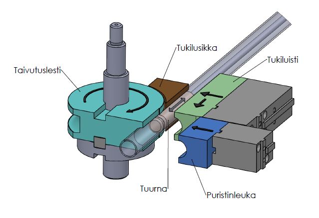 Tukiluisti tai vaihtoehtoisesti tukirullat: Pitää putkiaihion oikeassa asennossa ja tukee taivutusta